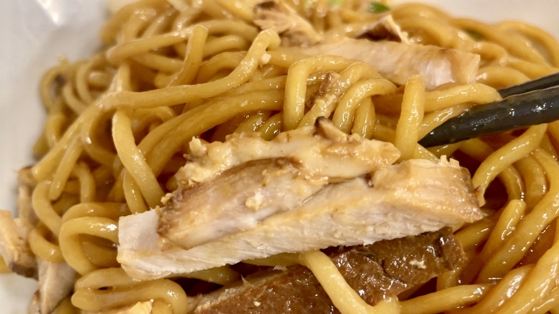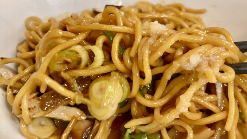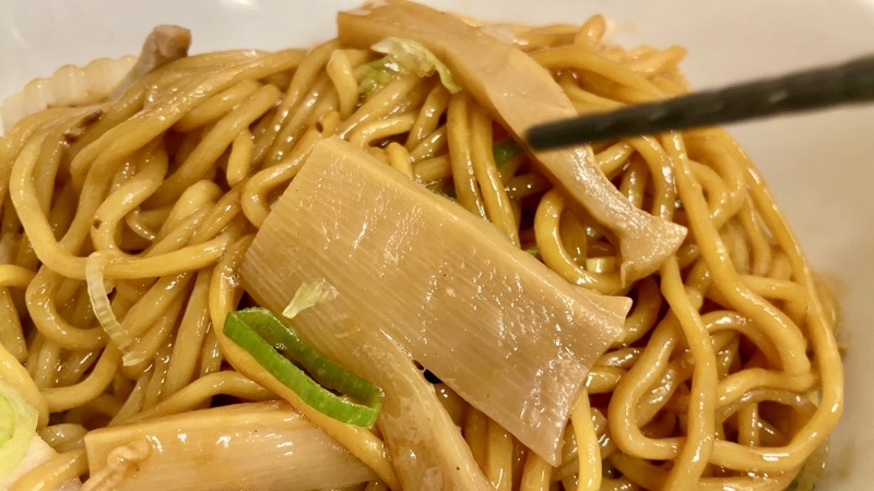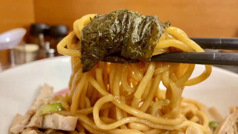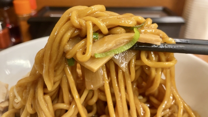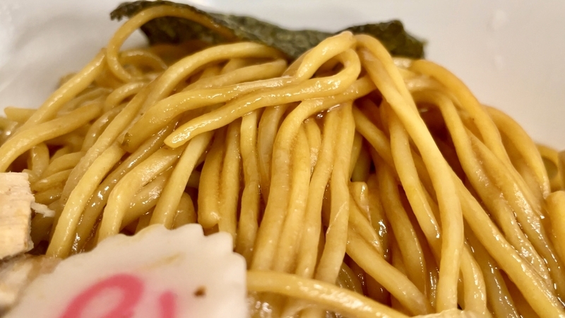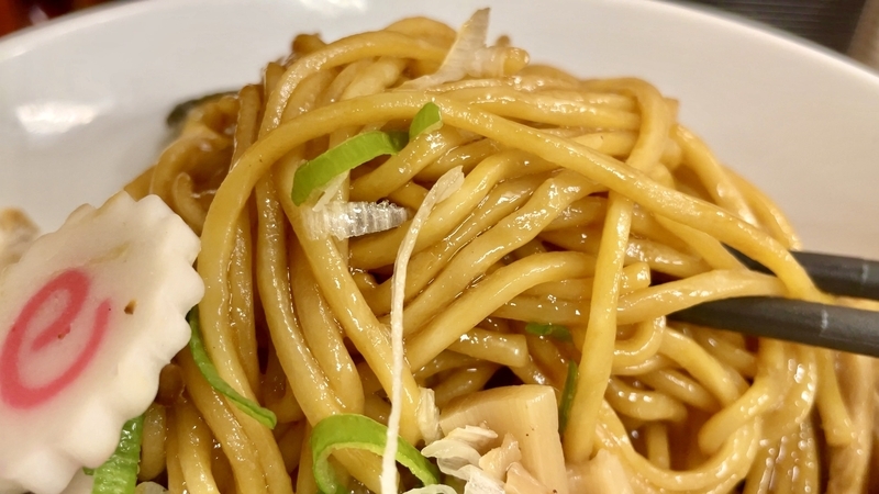 大勝軒らしいツルツルモチモチ中細ストレート麺!。汁系向けデフォルトにチューンした麺を、汁なし系に転向させるのが、偶然が生む妙な旨さが生まれる感覚。あらかじめタレを全体にしっかり絡められており、すでに染まったようで褐色地肌です。すでに麺に浸透し始めており、噛み締めるとタレと素地の甘味が旨さで一体感あるようです。