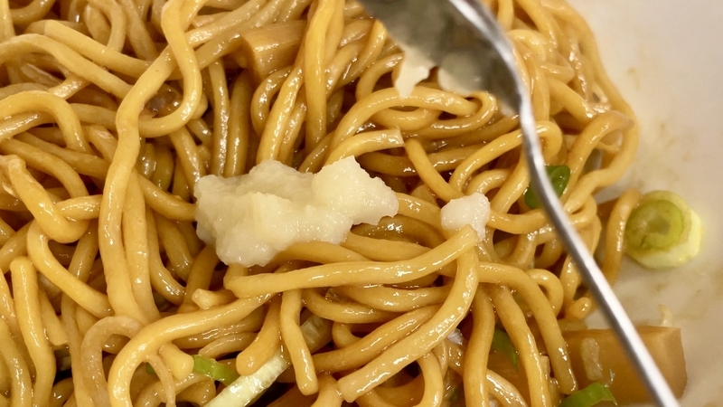 今回は、定番の業務用擂り下ろしニンニクをひとさじ。そして武蔵野風油そば流儀で、辣油とお酢を垂らします。通常だとこれやっちゃうと、どれも同じような武蔵野系油そばな味わいになってしまうのだが・・・・、やっぱり大勝軒風の魚介の甘味があるせいなのか、それになり切らず、デフォの味わいを残しつつ楽しめるところがまたいいね。