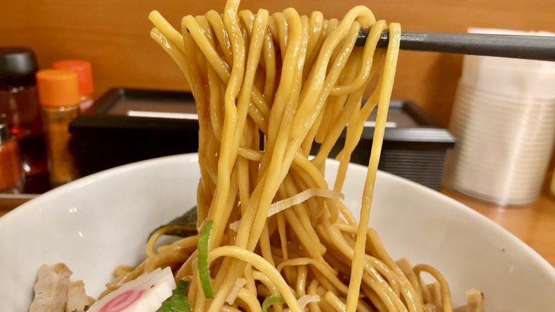 <麺> タレと麺の絶妙ハーモニー!大勝軒らしいツルツルモチモチ中細ストレート麺!明るい弾力!