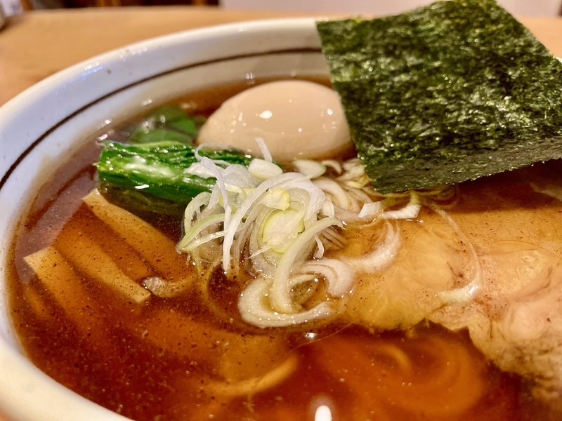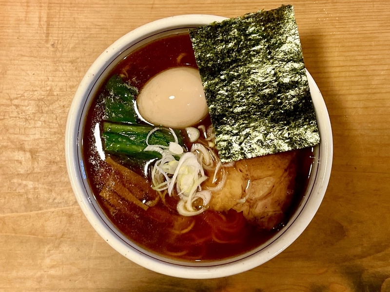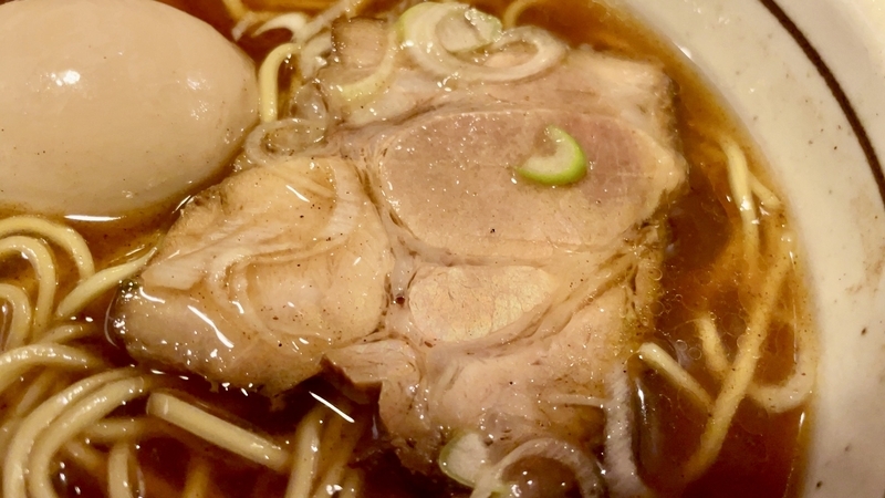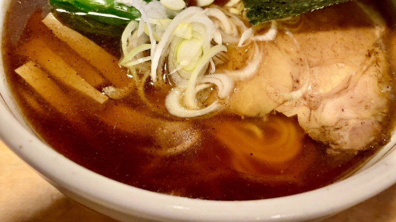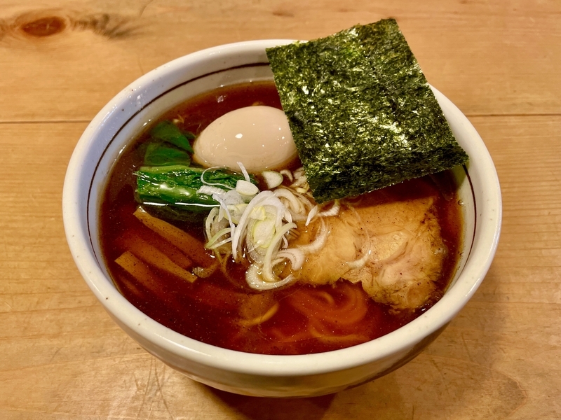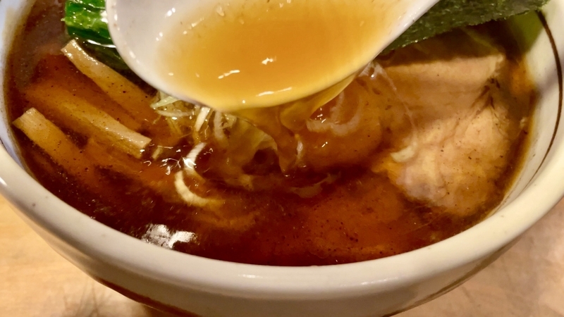 店内が広めで木製テーブルがメイン。無垢の感じがまた落ち着きを感じさせ、また間仕切りも自然にあって、一人客でかなり広めのパーソナルスペースが確保できます。またBGMは、坂本龍一のエナジフローが多く、しばらく座っていると魂安らぐってな感じです。そして何より、妙に混まずに食えるし、客層もハートフルな雰囲気で、並んで食っても気にならないのがいいね。今回は、こちらの自信メニューの醤油をいただいて参りました。