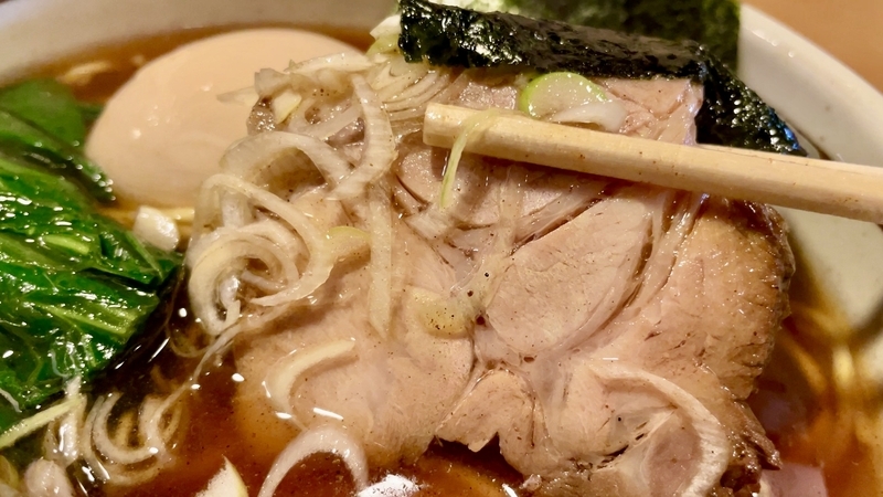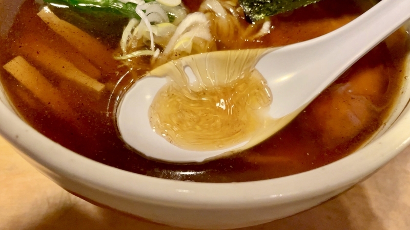 そして出汁に目を移せば、ややきっぱりと濃口醤油ブラウンをアピールしております。また出汁に透けて見える麺は、すでにやや褐色に染まるか?。そこに青菜が全体に色合いを添えるか・・・。更に肉は一枚肉でもボリューミー。雄々しい一枚海苔とメンマのプレゼンスも感じます。