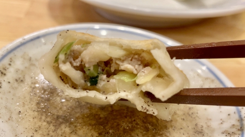 皮は、標準的な厚さで薄皮でもなく肉厚でもなくレギュラー。そして油っ家が割と低くてふわっと感を皮に感じつつ、一定の面はカリカリの焼き具合がしっかりとしています。その両極端な皮の食感を一気に噛み締めて肉餡と一体化して味わうのが痛快。