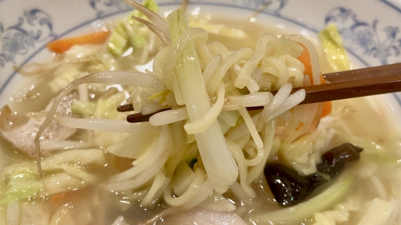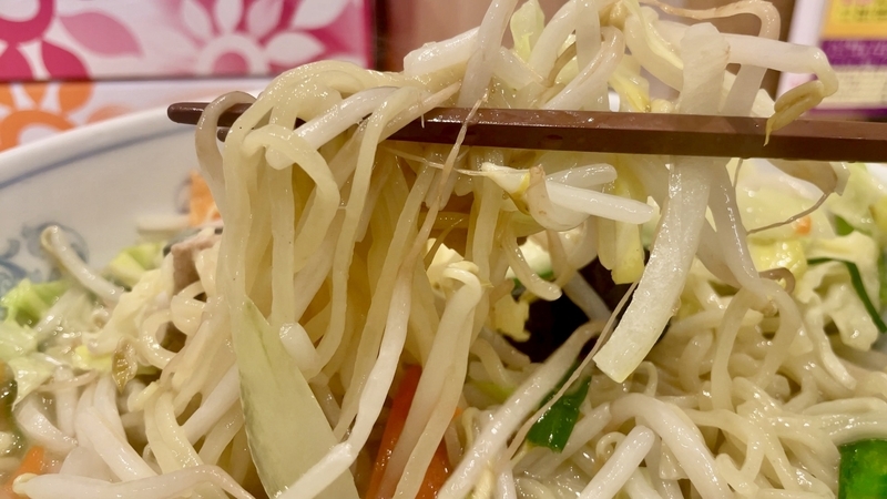 密度感が低い分、出汁を吸いやすく素地感が低いため、出汁の浸透した味わいがダイレクトに感じるタイプかと。しかも優しい塩出汁系だから、出汁の味わいをそのまま啜ってるって感覚かも。そしてシャキシャキな野菜炒めと絡むと食感にコントラストが微妙に生まれ楽しいしかと。