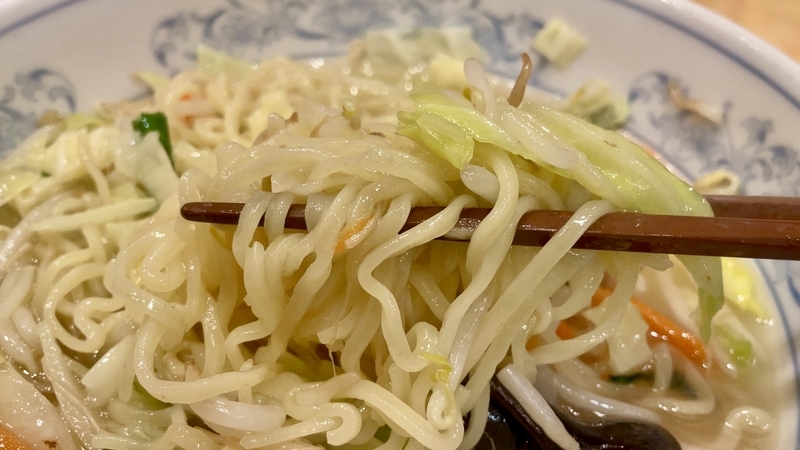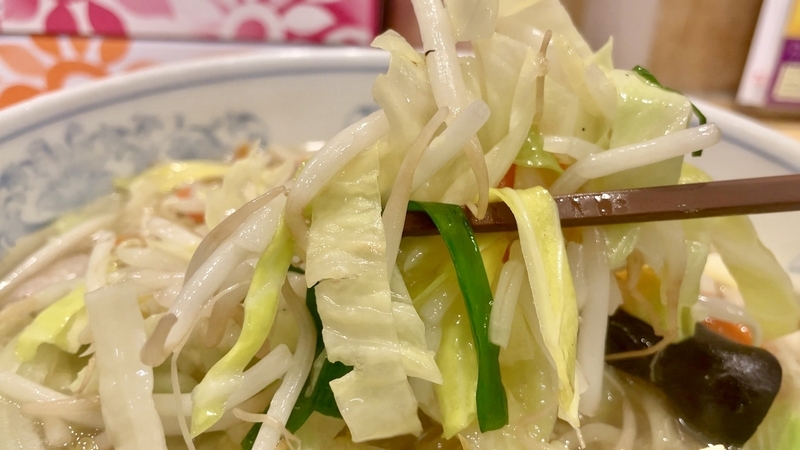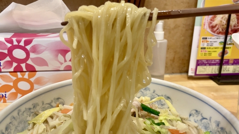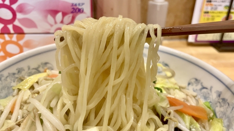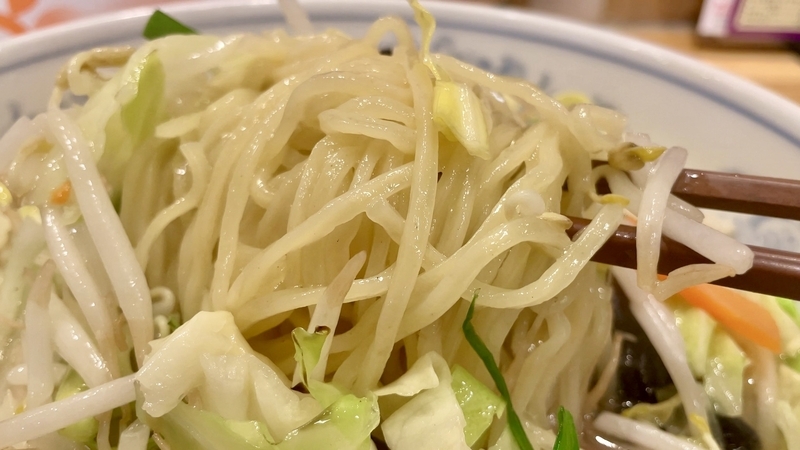 鎖系の汁系の麺って共通するのは、多加水系で潰し込みが低く、ライトでスパスパと歯切れ、クチクチと奥歯で潰しやすく、表面がツルツルしてて啜りやすいイメージ。これも悪くないね。そしてタンメンの場合、こう言うのが実にあいます。