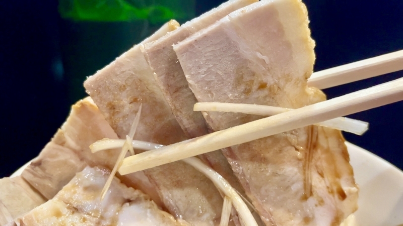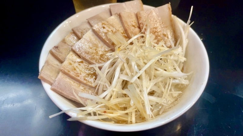 以前は刻みネギだったトップが、今日は味付白髪ネギに。ひと手間の艶と立ち上るごま香が加わり、皿全体の印象はぐっと上品に。だが主役はあくまで豚バラで、整然と並ぶ“1ダース=12枚”の光景はいつ見ても拍手もの。